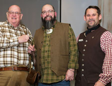 Guild member James Pease has graciously donated a Dixon’s Judges’ Choice Award winning Berks County Screw tip horn and bag set to help support the mission of our organization. The bag is nicely lined and with an internal pocket, displays a fine piece of hair-on bovine hide which accents the finely crafted powder horn in shape and tone. With an adjustable strap using a brass buckle resembling originals, this will suit just about anyone on a trek or daytime frolic. Accompanying this set is a handmade turned bone pick and brush set kept with a handmade chain donated by member Ray Antosh.