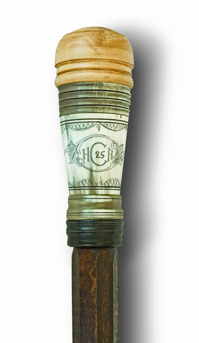 Rex Reddick of Denison, TX: A wonderfully crafted, traditional style walking stick of curly maple in a tapered octagon form. It features a turned, pear wood top with 3 horn bands encompassing a “cup” engraved with the cartouche of the HCH’s 25th Anniversary. This, along with the two piece horn tip is reminiscent of the various parts of a powder horn.