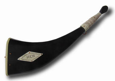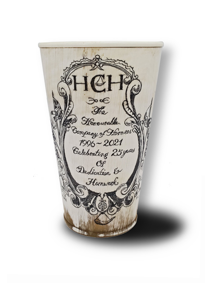 John DeWald of Pennsdale, PA: A delicate all horn beaker with horn handle and rivets. The cartouche was inspired by the HCH’s 10th Anniversary tee-shirt designed by Willy Frankfurt The script inside was also changed to reflect the Guild’s 25th Anniversary.