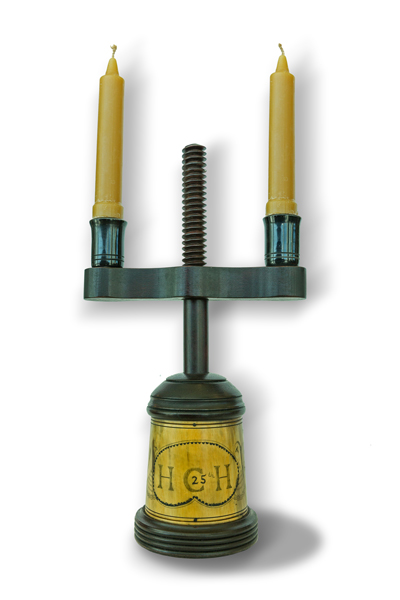 Tim Sanner of Rockwood, PA: An intriguing double candle holder in his own original design. The main body is comprised of rounded horn, engraved in the style of John Bush and includes the HCH Anniversary logo. The cap and bottom are made of hand turned sapele wood. The adjustable arm, also made of sapele, is threaded onto a dowel of maple wood and threaded for the arm’s height adjustment. To finish the design, tin cups hold beeswax candles.