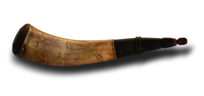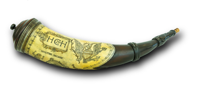 Rick Sheets of Durham, NC: A beautiful, neutral curved powder horn with engraving inspired by Richard Cresey, also known as “The Hellhorse Engraver”. The horn has a low cherry dome butt with incised design and a light artificial patina. It comes with a Polizzi woven strap and a display stand.