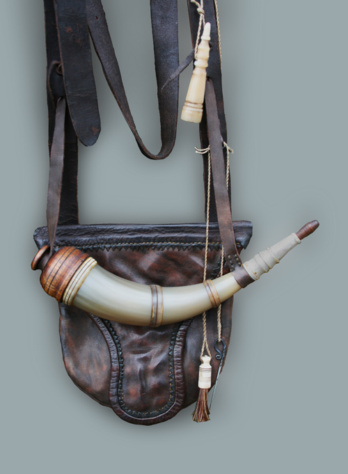 The pouch was made by Jeff Bibb and is a copy of an original pouch from Iredell County, NC. Constructed from cowhide, the pouch is 6.5 inches wide by 7 inches deep. The flap is bound and backed with hemp. There is a hanging ball or patch pocket inside. (See Jeff Bibb’s website by clicking here.)